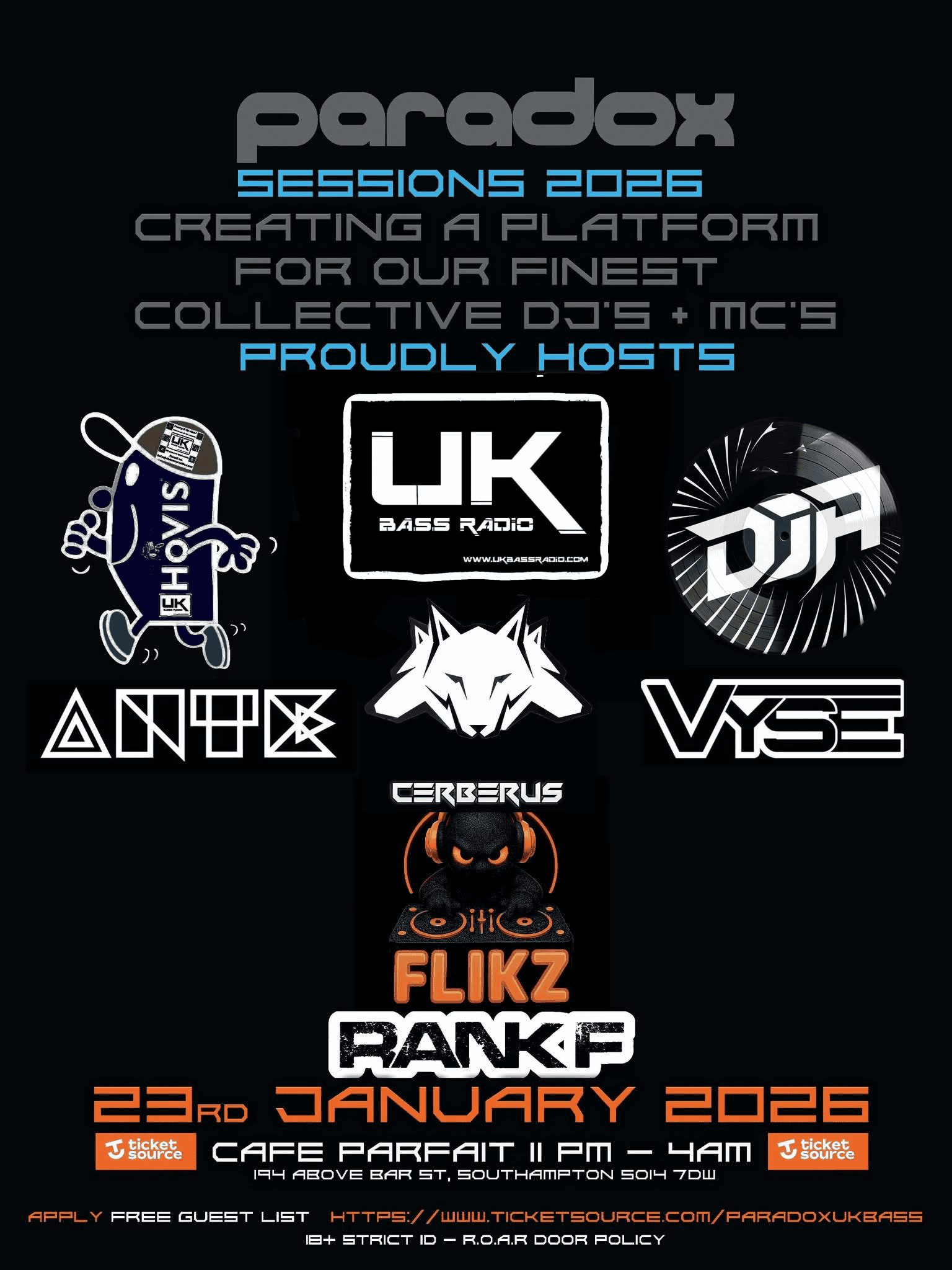 Paradox and ukbassradio have teamed up for a live night in Southampton on 23rd January 2026. 11pm – 4am. Streaming live on the main site, FB, Twitch and Mixcloud. Free tickets available via: https://www.ticketsource.co.uk/paradoxukbass/t-mjorrdj?fbclid=IwVERFWAOsDbRleHRuA2FlbQIxMABzcnRjBmFwcF9pZAo2NjI4NTY4Mzc5AAEejWAT1VIuwmOHXhpPAEBoBBWYI1liv5IyC4ZidjAIlD8iareVi2SMMZSpbbU_aem_cEwxmo-2Dbbi7o9ojfJ70A